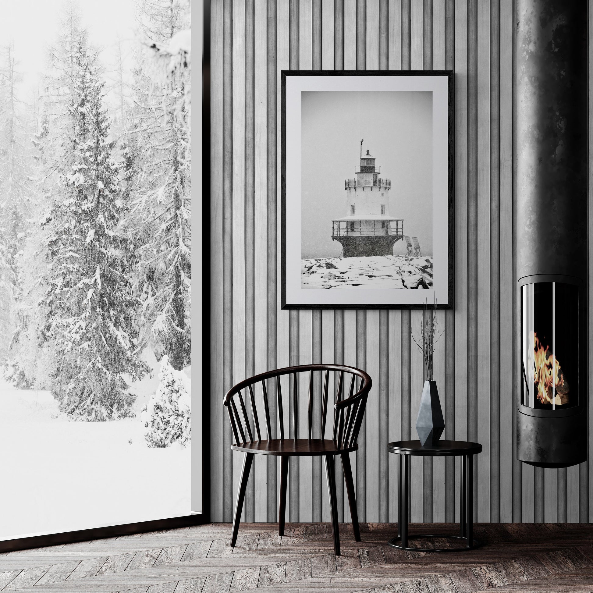 “Lighthouse Blizzard ” Fine art photography print taken by Jessica Joy of Springpoint Ledge Lighthouse in Portland, Maine.